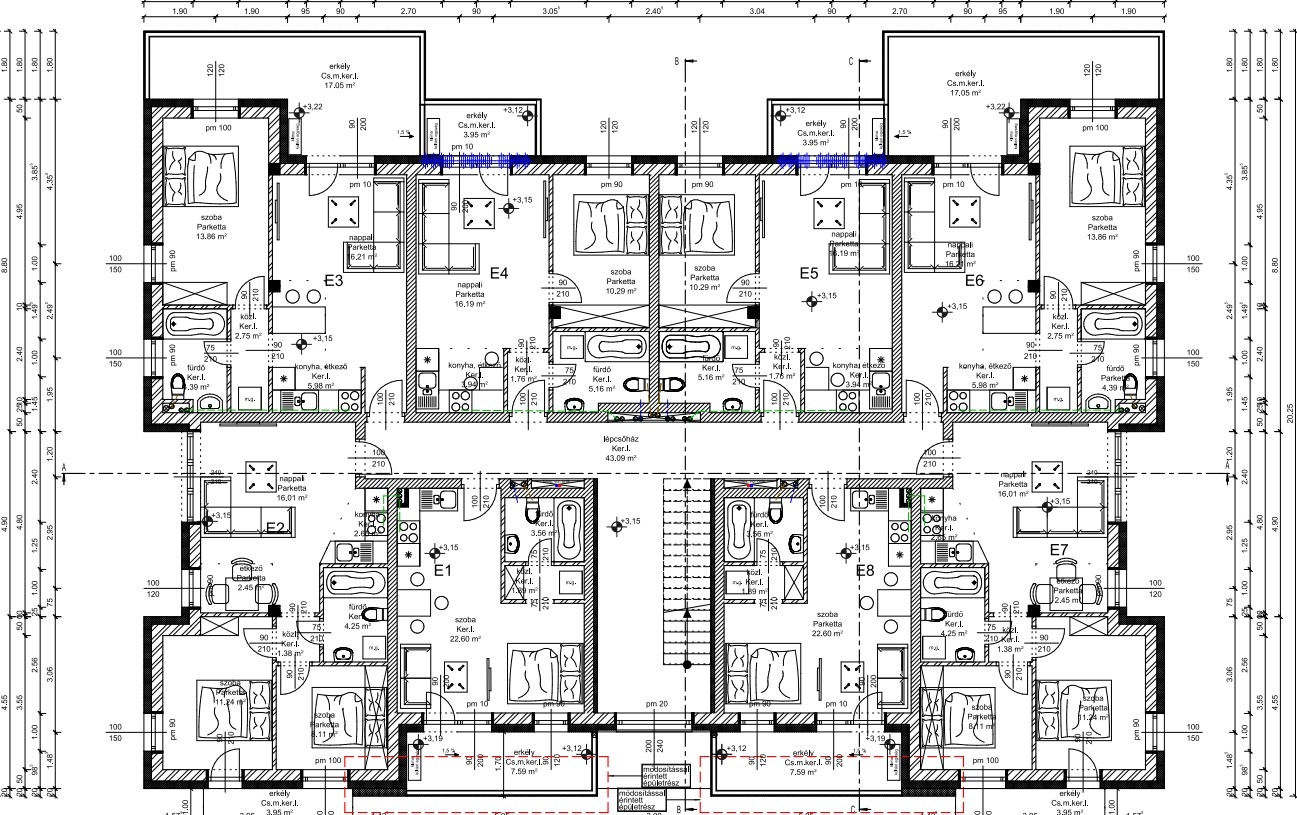 E-1 jelű: 28.05 m2 (nappali-konyha-étkező, közlekedő, fürdő WC-vel, erkély 6.61 m2 à Ára: 31.000.000 Ft